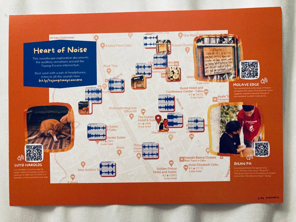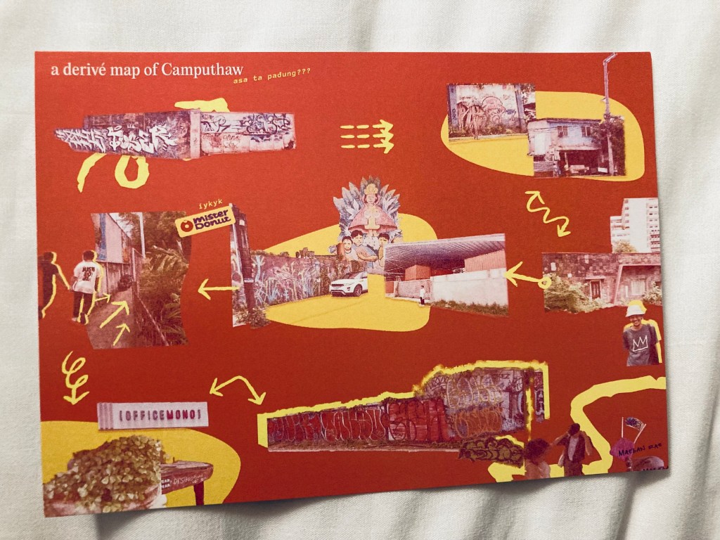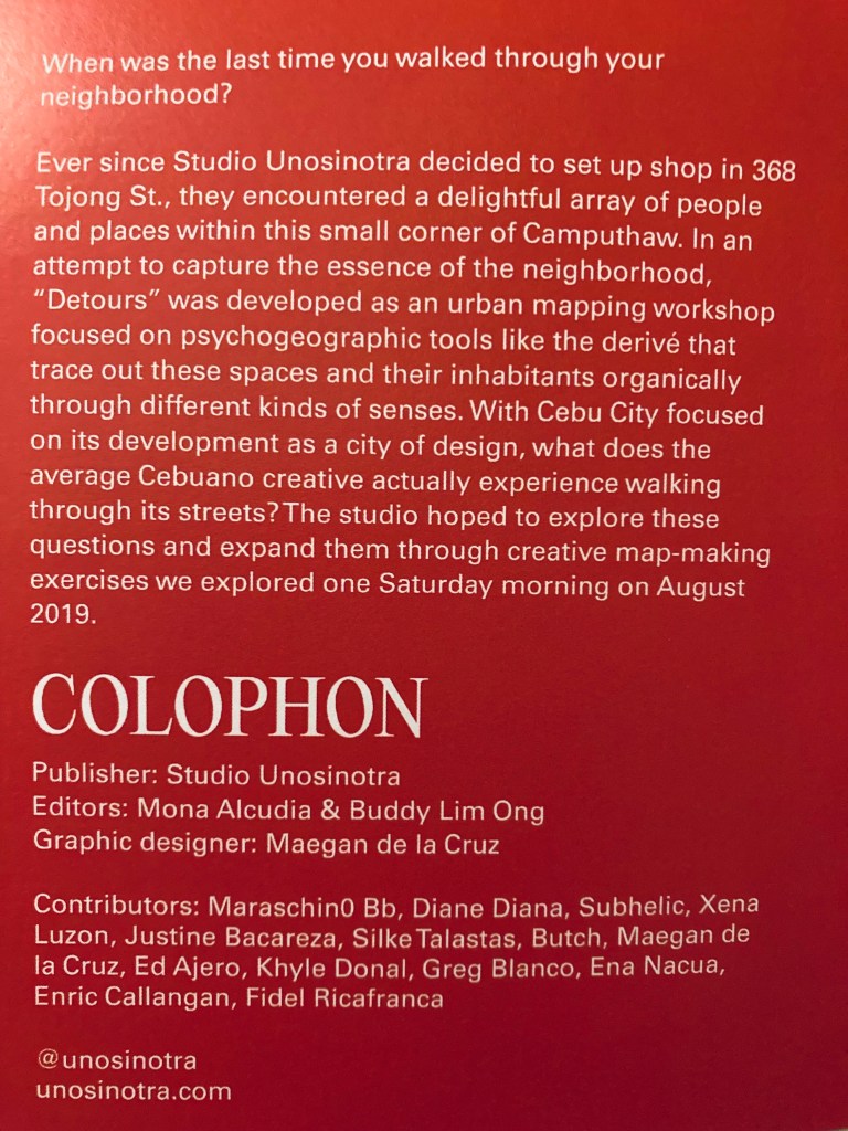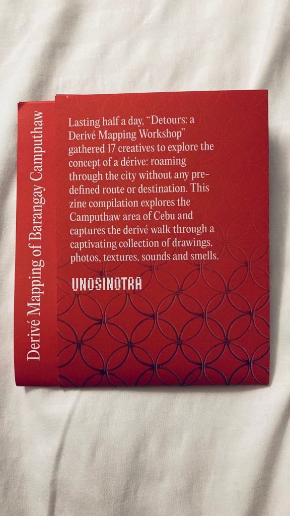 This work took me by surprise. What caught my attention were the bookends and figures holding this studio’s pieces down, depressed women. I’m not even kidding. This sparked a conversation between the artist at the booth and myself. She then showed me this red folded paper, Detours. This zine is a product of a derivé mapping workshop by 17 creatives who roamed and explored Camputhaw, Cebu in 2019. It even came with a postcard (slideshow 2 of 8) with QR codes leading to the recordings of the soundscape in the area. What’s really cool is they made rubber stamps from the different patterns they saw in the neighborhood (slideshow 1 of 8). You can take a closer look at the routes the creatives took (slideshow 6 of 8).