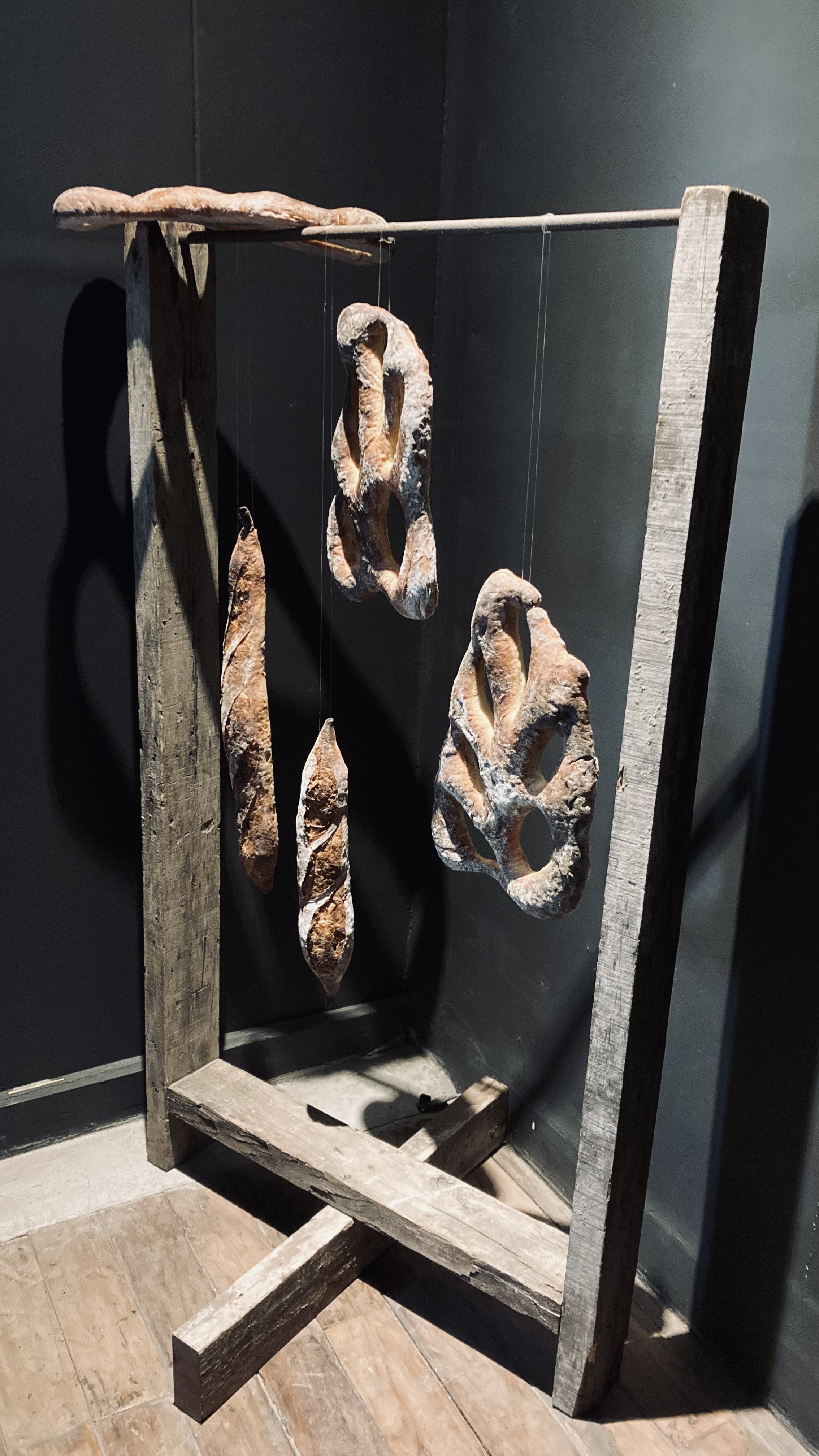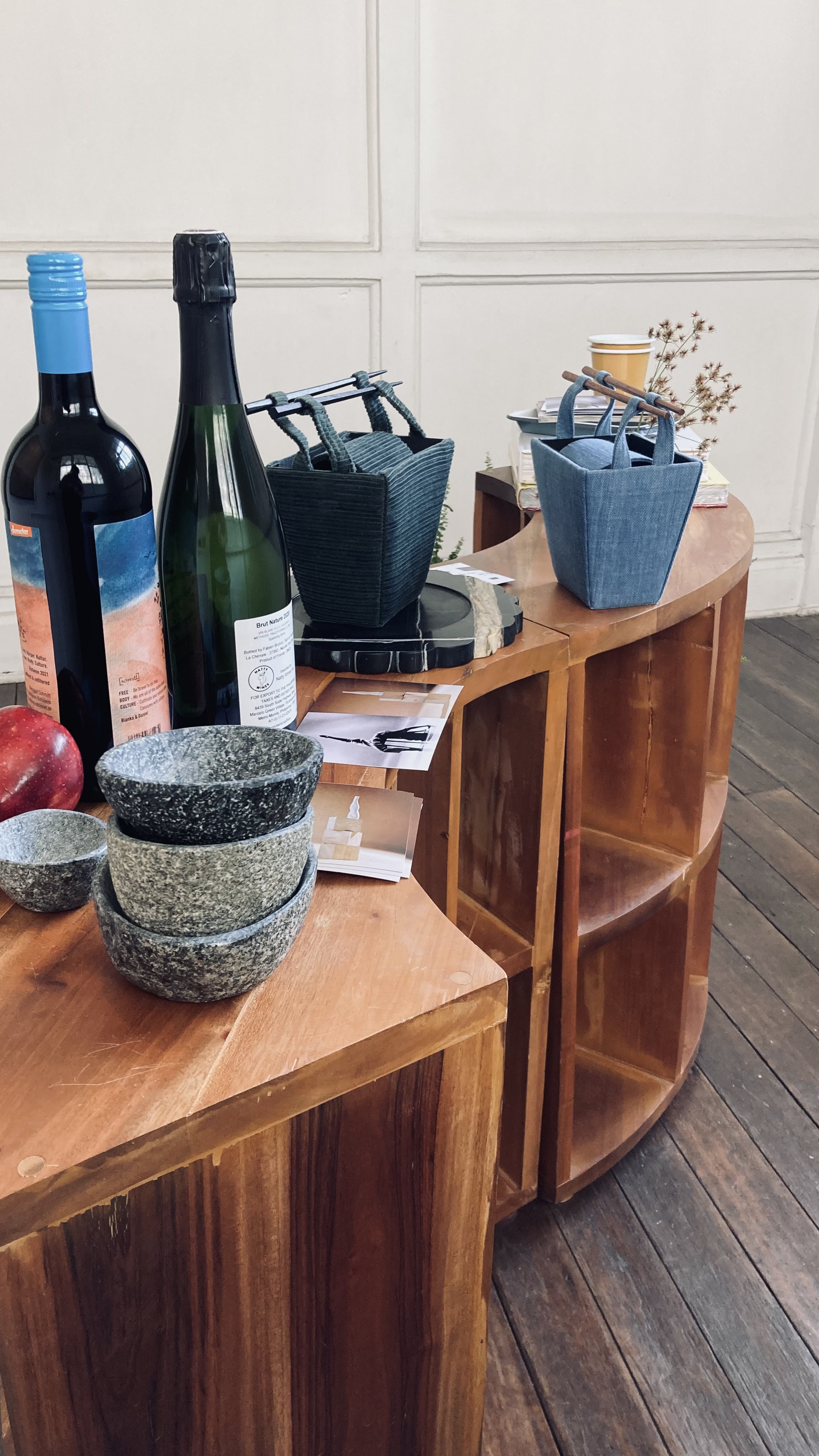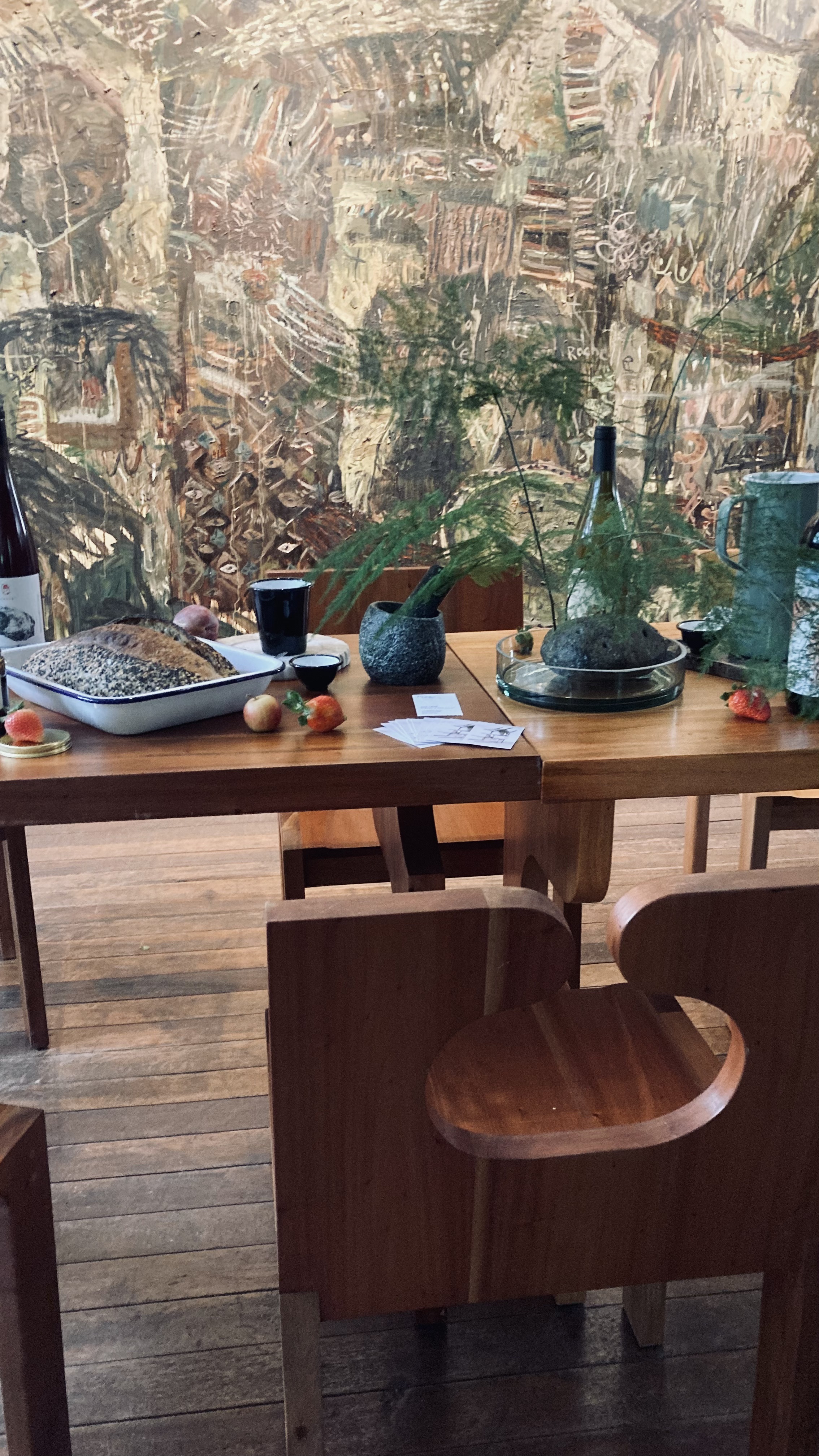 JM Avenido, the creative director, warmly guided me through the galleries as a host would with his esteemed guest. We started by the outdoor staircase with an elegant piece from Ren Marble. We then walked up to the second floor landing where a sculpture of hanging sourdough breads from Scratch welcomed us (top of page: middle picture, second row). We proceeded to wander through the different rooms: the foyer, library (top of page: first two pictures, first row; bottom of page: second video, bottom row), dining room (top of page: last two pictures, first row), and wash room (bottom of page: third video, bottom row) to name a few. Each space was carefully put together with dinnerware from Hoom, wines from Some Love, furniture from Nooke, flowers and fruits from Moko Plants and Happy Fruits, scents from Saan Saan, and bags from Play Nice. The indoor staircase led down to the socials area where the feast continued amidst the background of bamboo swaying gracefully with the wind (bottom page: first video, bottom row).